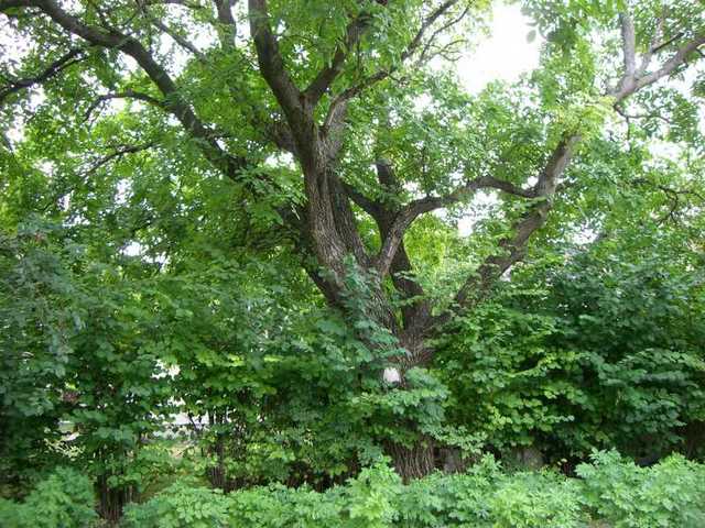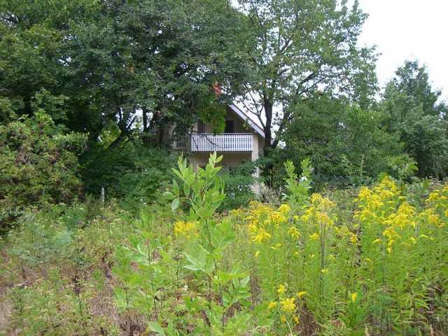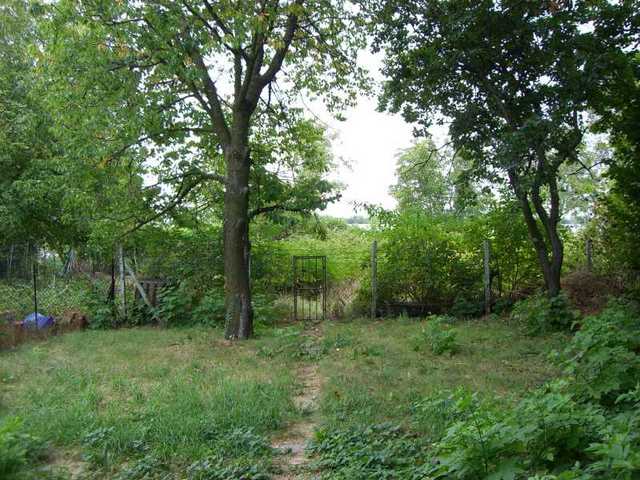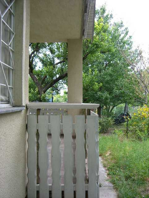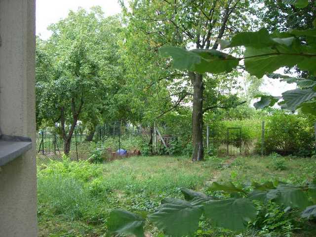 Von der Terrasse bzw. vom Balkon blickt man in den Garten, der aus einen vorderen und abgrenzten hinteren Teil besteht. Im Garten befindet sich ein Nuss- und ein Kirschbaum.